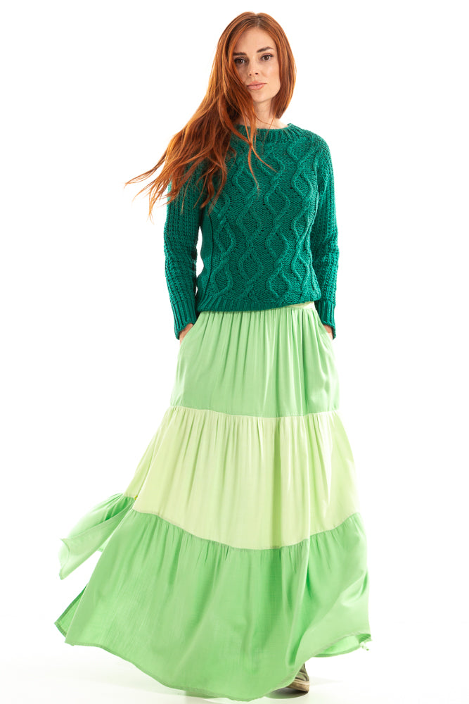 A saia com babados é perfeita para quem busca um toque boho e descontraído no visual.